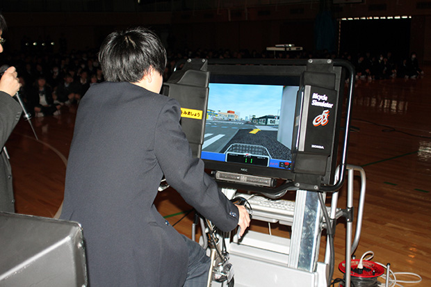 あいにくの雨天のため、当初予定していた屋外での集会が体育館での実施となりましたが、自転車シミュレーターを持参していただき、わかりやすく解説していただけました。